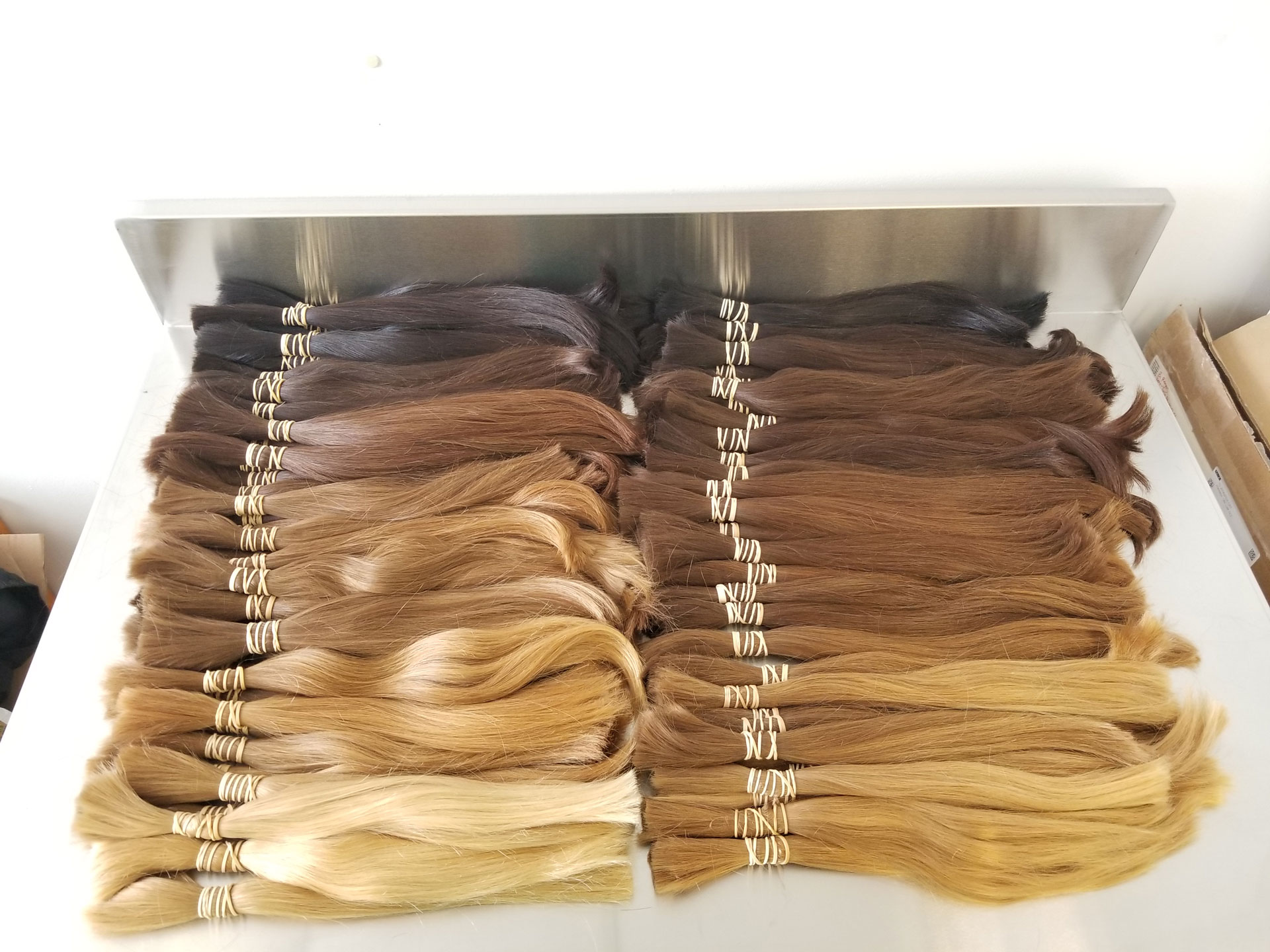 Each set of hair extensions consists of 2 clip-in pieces. The upper piece is approximately 12″ and the bottom piece is approximately 9.5″ to 10″. Multiple hand-tied micro wefts are sewn onto lace, and kept as lightweight as possible. By using micro wefts, our hair extension pieces are kept incredibly flat in order to be undetectable when clipped into an individual’s own hair. Due to being hand-made, weight can vary but each 13″ set contains approximately 1.25oz to 1.5oz of hair, 15″ set contains approximately 1.6 to 1.8oz of hair, and 17″ set contains approximately 2oz to 2.25oz of hair. Hair care instructions are included with each set of hair extensions , as well as a complimentary mini hair care sample kit (includes shampoo, conditioner, leave-in treatment, and hair brush).
